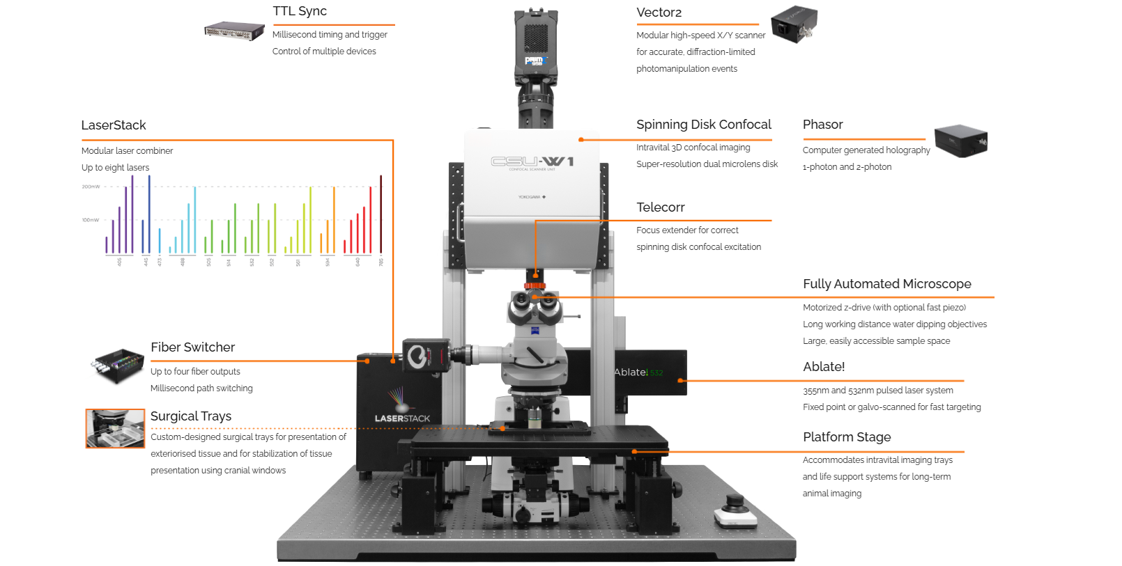 • 多功能光操控功能:集成355nm和532nm脉冲激光消融系统,可实现定点细胞消融、血管内皮损伤诱导,同时支持光激活、光转换及计算机生成全息光操控,可完成活体光遗传学、血栓形成诱导等复杂实验。