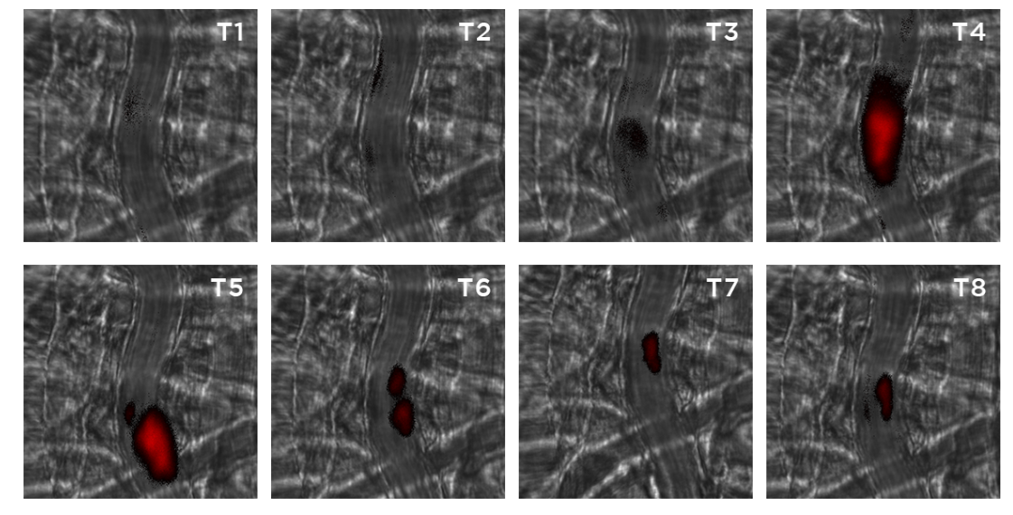 • 高速动态成像功能:搭载高灵敏度sCMOS相机与快速激光切换模块,成像速度可达毫秒级,可实时捕捉活体微血管中血小板黏附、血栓形成、白细胞滚动等快速动态过程,满足活体动态追踪需求。